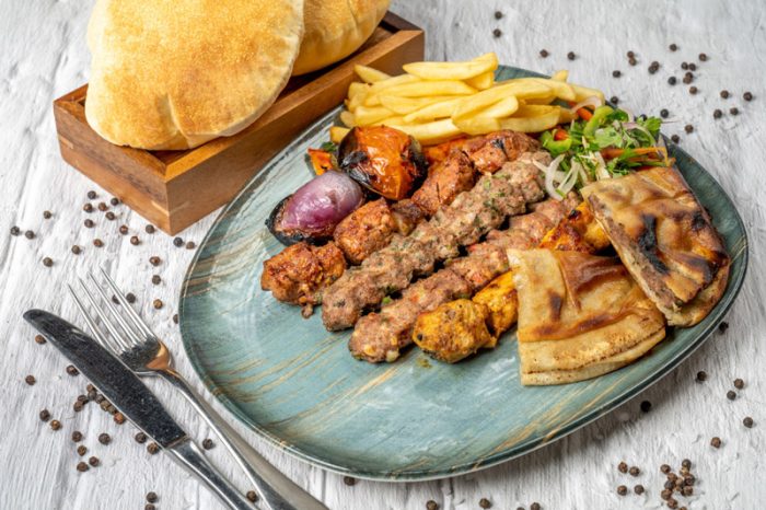 Shish tawook, lamb cubes, kebab, cheese kebab, arayes and French fries.